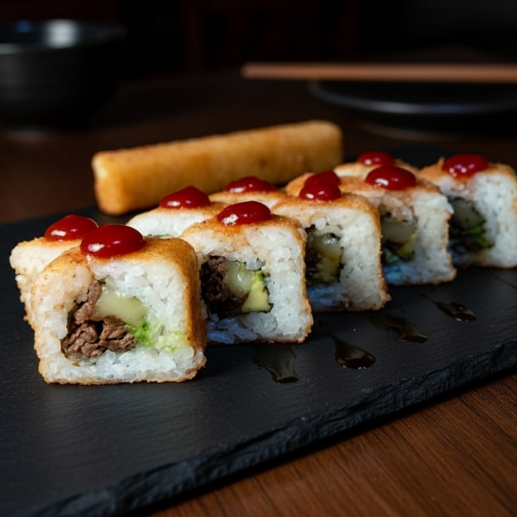 Por Dentro: Camarón Empanizado-Filete de res- Aguacate y Queso Philadelphia. Por Encima: Pasta Tampico-Salsa Sriracha y Cebollín.