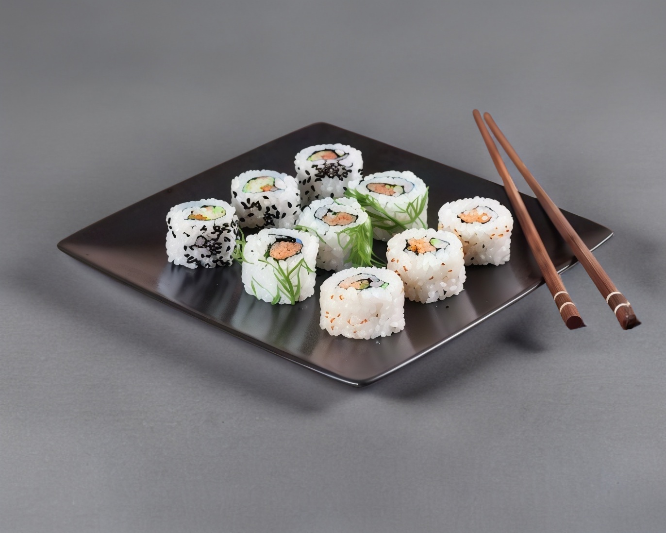 Philadelphia, aguacate, surimi y pepino cubierto de ajonjolí.