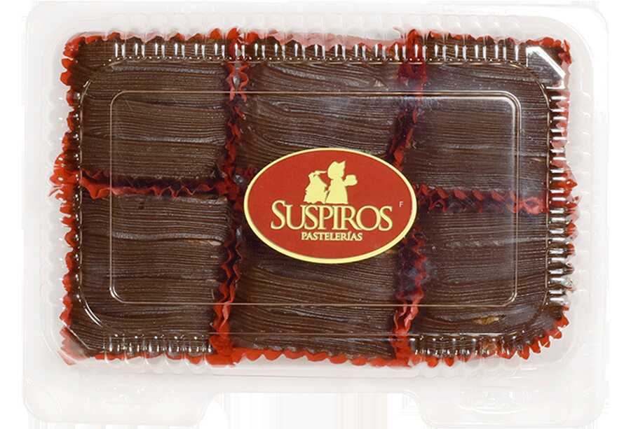 Pan chocolate, reposado en 3 leches, cubierto con crema Suspiros y decorado con almendra fileteada, una flor de sirope, chispas de chocolate y trocitos de cerezas.
