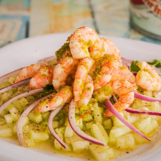 CAMARON (170G), PICO DE GALLO, PIÑA, PEPINO, AGUACATE Y CILANTRO