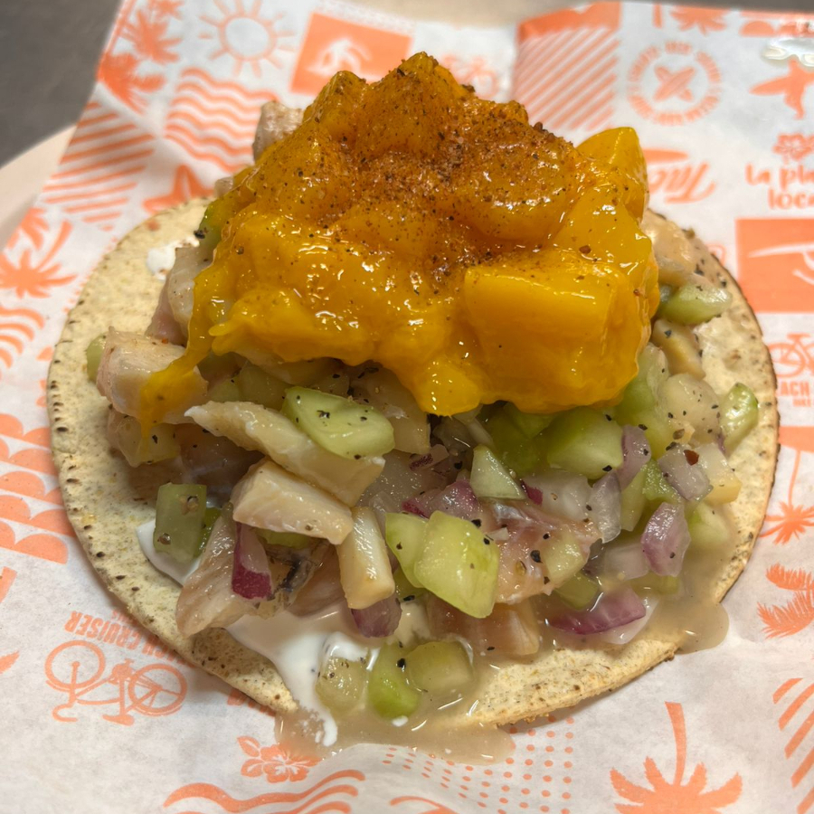 PESCADO COCIDO EN LIMON, MANGO CEBOLLA MORADA, PEPINO Y ADEREZO TACO BAJA