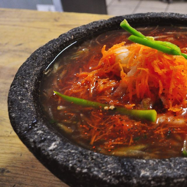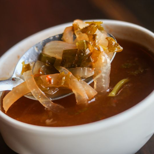 SALSA DE CHILE MORITA, CONSOME DE CAMARON EN SALSAS NEGRAS CON JICAMA, TIRAS DE CHILE SERRANO, ZANZAHORIA Y PEPINO