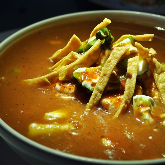 SOPA AZTECA CON CAMARONES, TORTILLA FRITA, QUESO PANELA, AGUACATE Y CREMA ACIDA