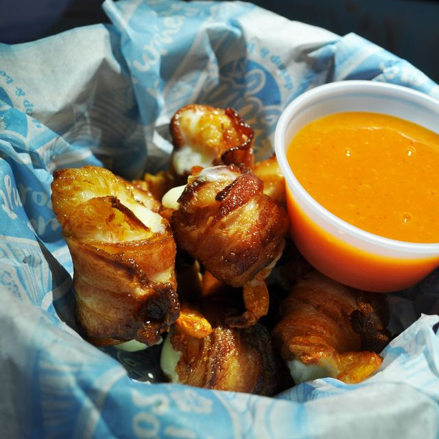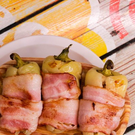 CAMARONES ENROLLADOS EN TOCINO ACOMPAÑADA DE SALSA MANGO HABANERO