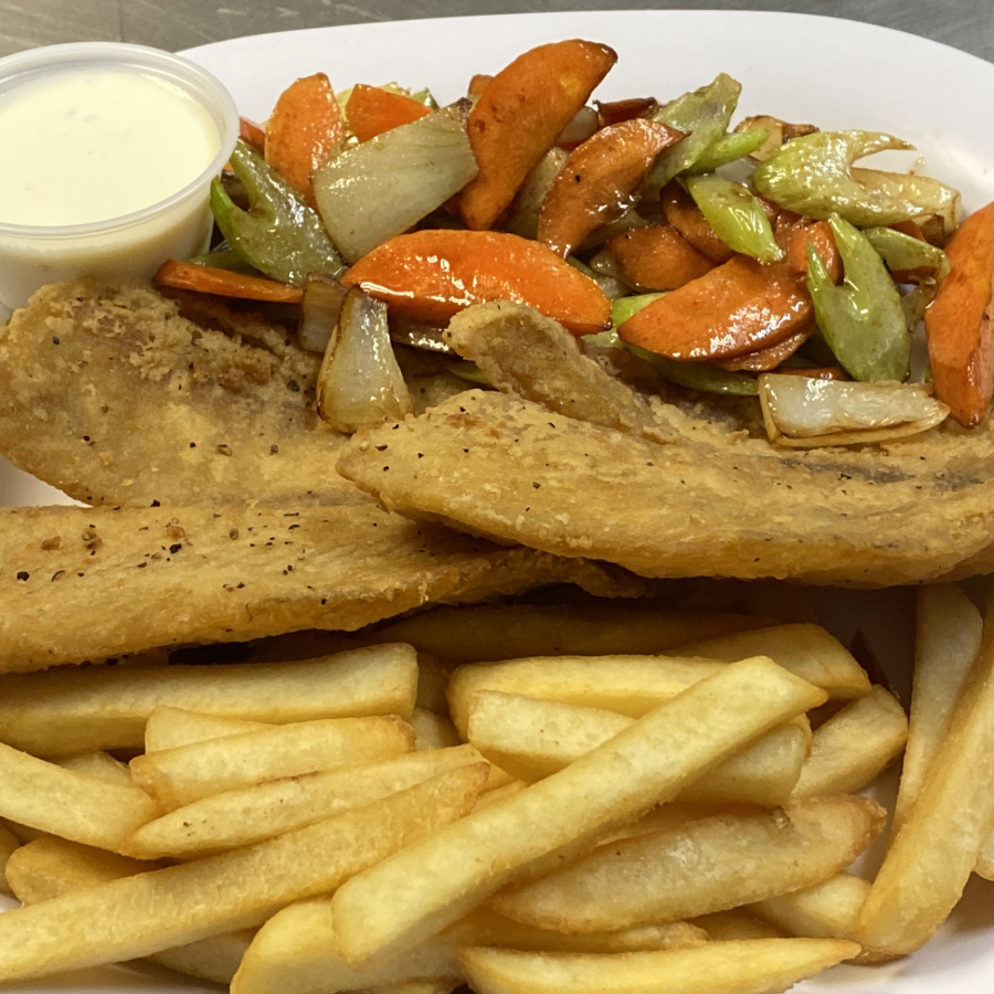 2 FILETES DE PESCADO EN HARINADOS Y FRITOS ACOMPAÑADOS DE VERDURAS SALTEADAS Y PAPAS A LA FRANCESA