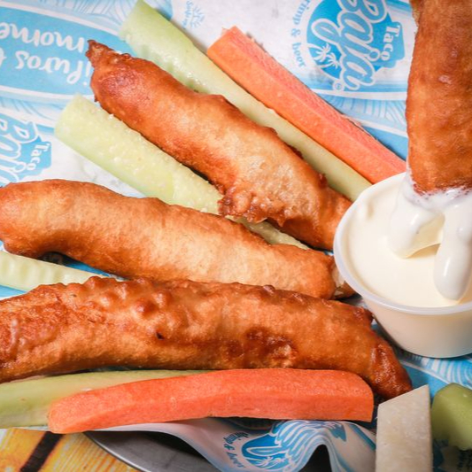 DEDOS DE PESCADO LAMPREADO, ACOMPAÑADOS DE ZANAHORIA, PEPINO, APIO Y ADEREZO TACO BAJA