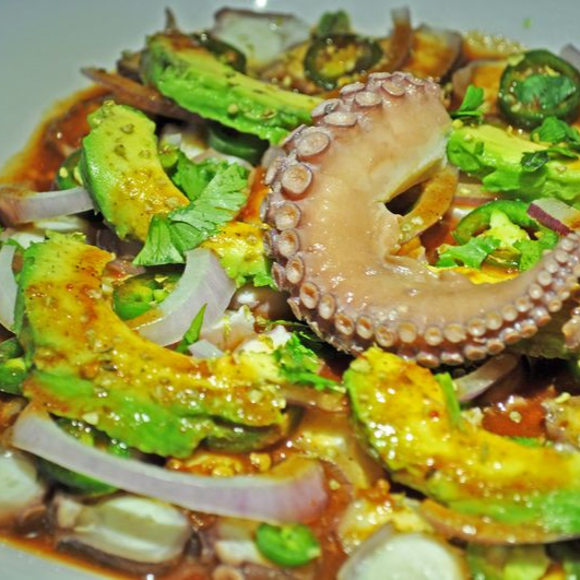 PULPO BAÑADO EN SALSA MORITA, ACOMPAÑADO DE CEBOLLA MORADA, AGUACATE, CILANTRO Y OREGANO