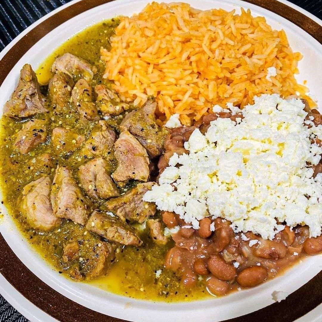 Riquísimo asado verde acompañado de arroz rojo y frijolitos refritos,3 tortillas hechas a mano del rancho a tu mesa