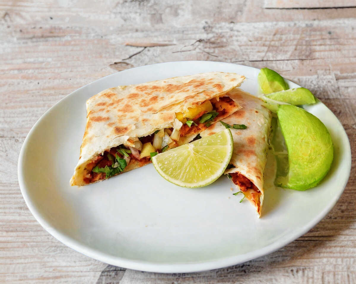 Quesadilla con Bisteck Acompañado con Salsas y Verdura