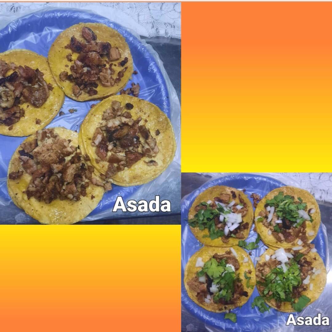 5 Tacos con tortilla sencilla, que incluye cebolla, cilantro, repollo, rabano y una salsa favor de elegir (roja, verde, naranja y tomatillo asado)