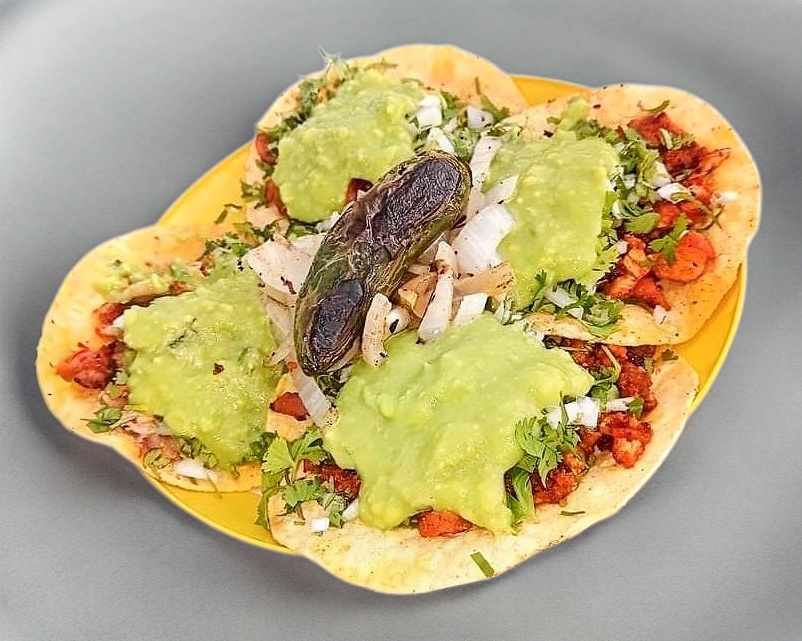 Preparadas con cebolla cruda, cilantro, guacamole y cebolla asada; lleva limones, pepino, salsa y cebolla morada con habanero.