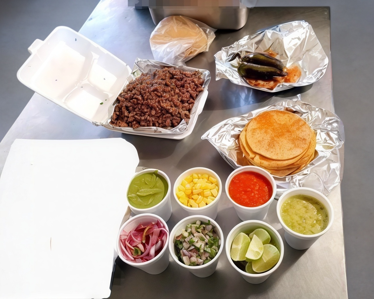 Incluye: tortillas de maíz, cilantro con cebolla, salsa verde, salsa roja,limones, guacamole,cebolla morada con habanero,chiles toreados, cebolla asada