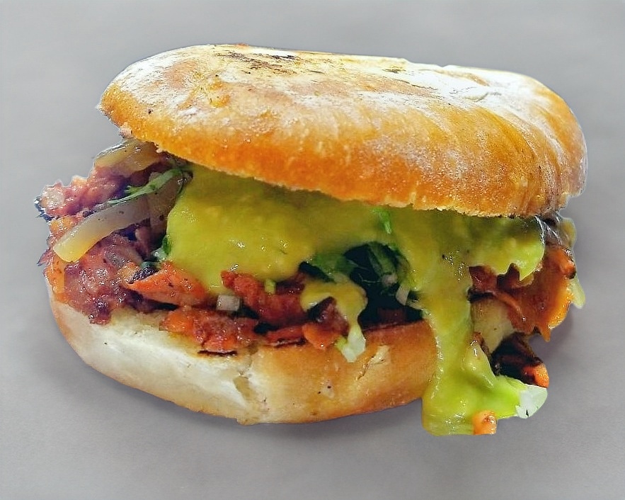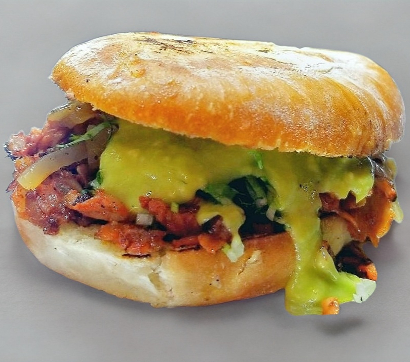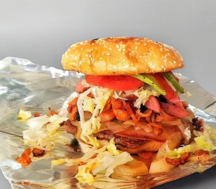 Carne de hamburguesa, carne de pastor, queso amarillo, winy, jamón, lechuga, tomate, cebolla asada y aguacate; con mayonesa, cátsup y mostaza.