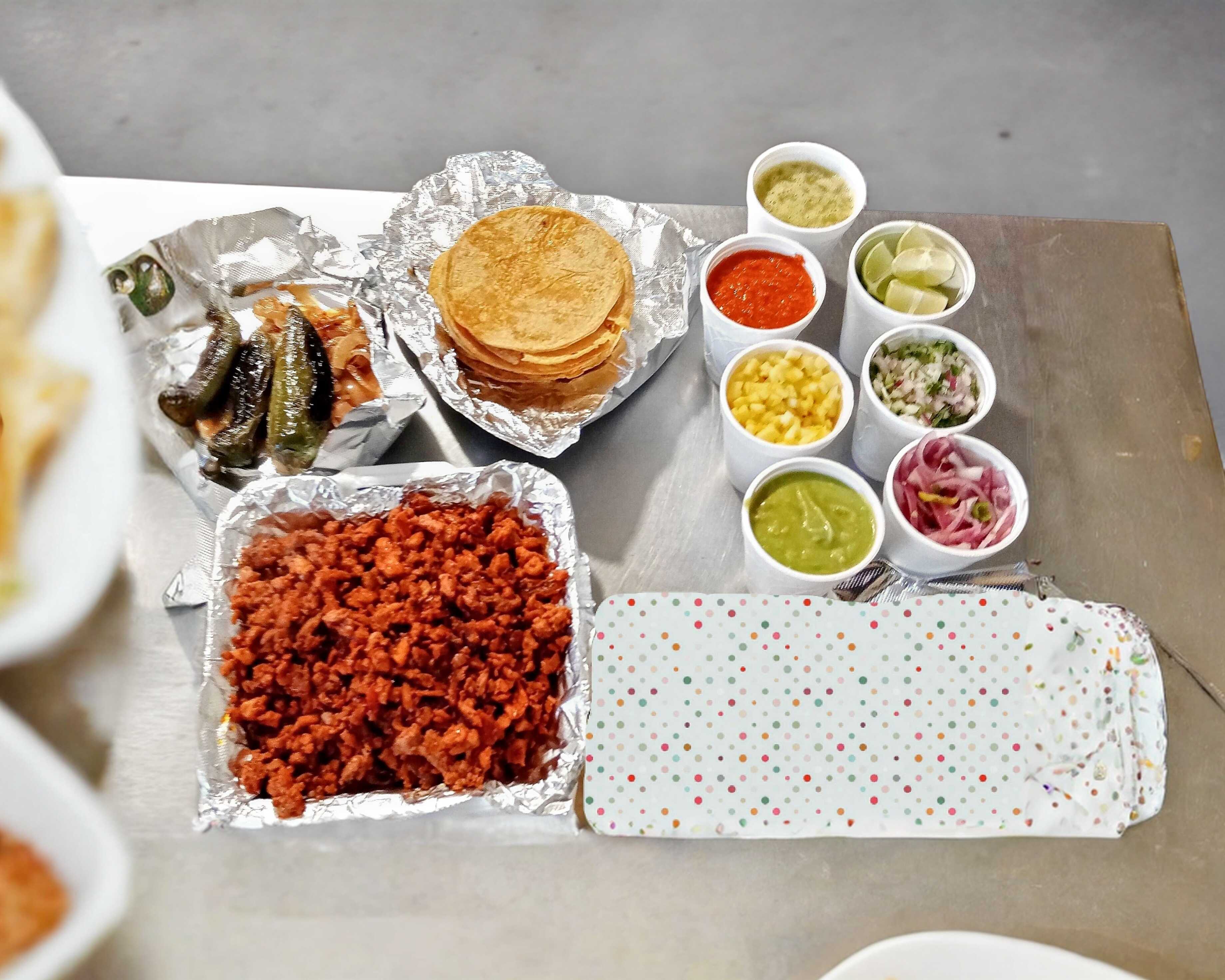 Incluye: tortillas de maíz, cilantro con cebolla, salsa verde, salsa roja,limones, guacamole,piña,cebolla morada con habanero,chiles toreados, cebolla asada