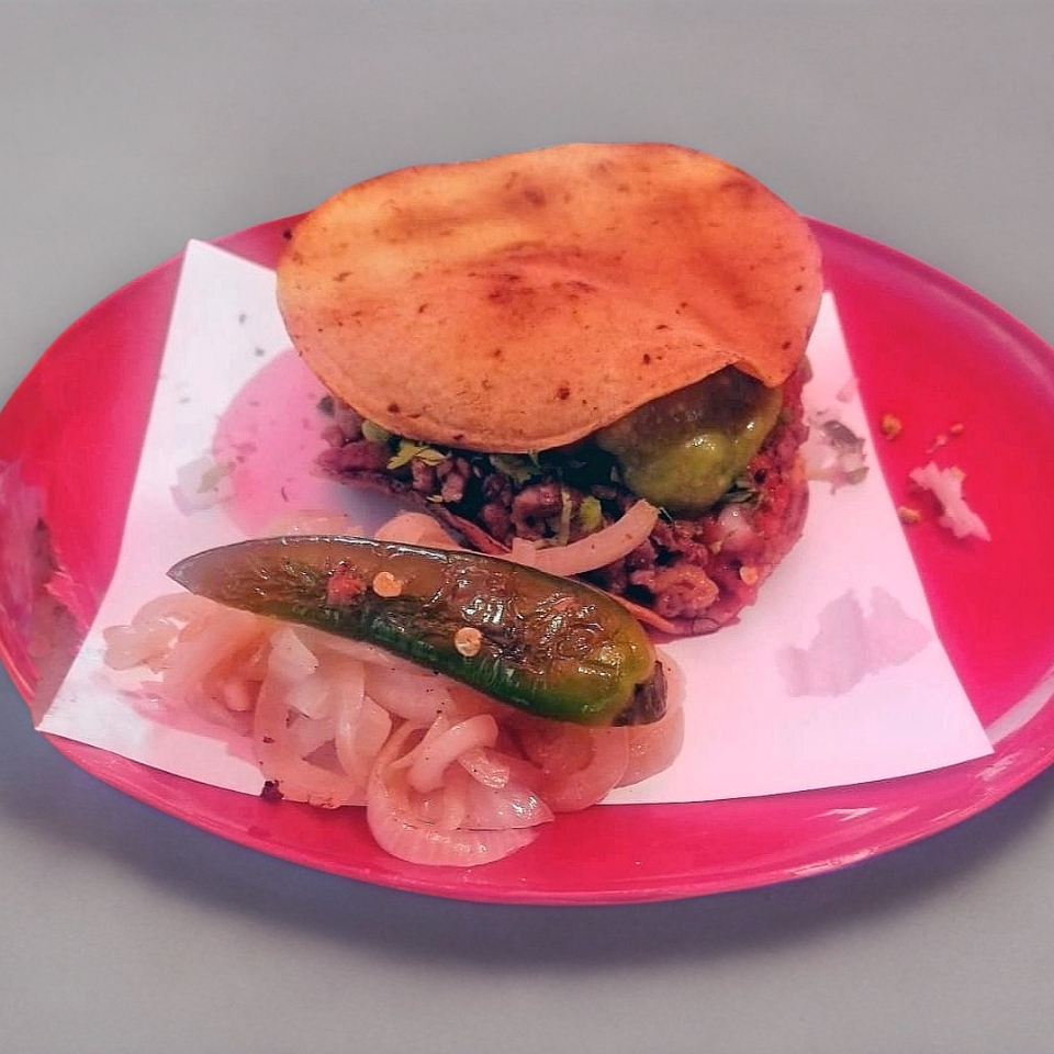 Preparada con cebolla cruda, cilantro, guacamole y cebolla asada; con limones, pepino, piña, salsa y cebolla morada con habanero.