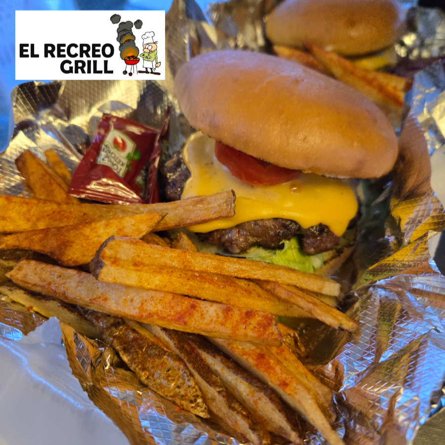Carne de res calidad Angus preparada en casa, pan brioche, queso amarillo, queso menonita, vegetales. Acompañada con papas fritas.