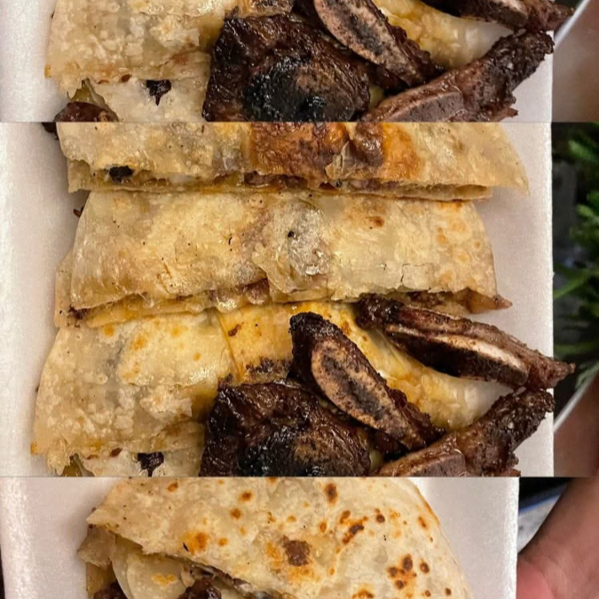 Quesadillas de Short Rib calidad Angus asada al carbón en tortilla de harina estilo sonora y queso menonita.
