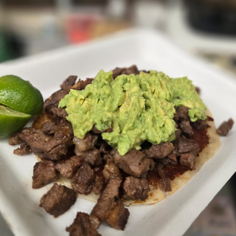 Taco de Asada calidad Angus al carbon en tortilla de maíz 12cm recién hecha con costra de queso y guacamole.
