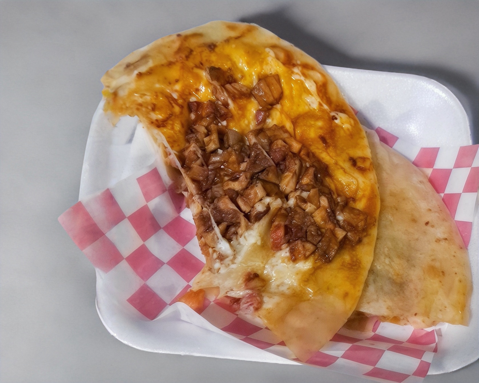 tortilla dorada con queso gratinado y carne al pastor, acompañado de salsa verde, salsa roja, guacomole, y piña