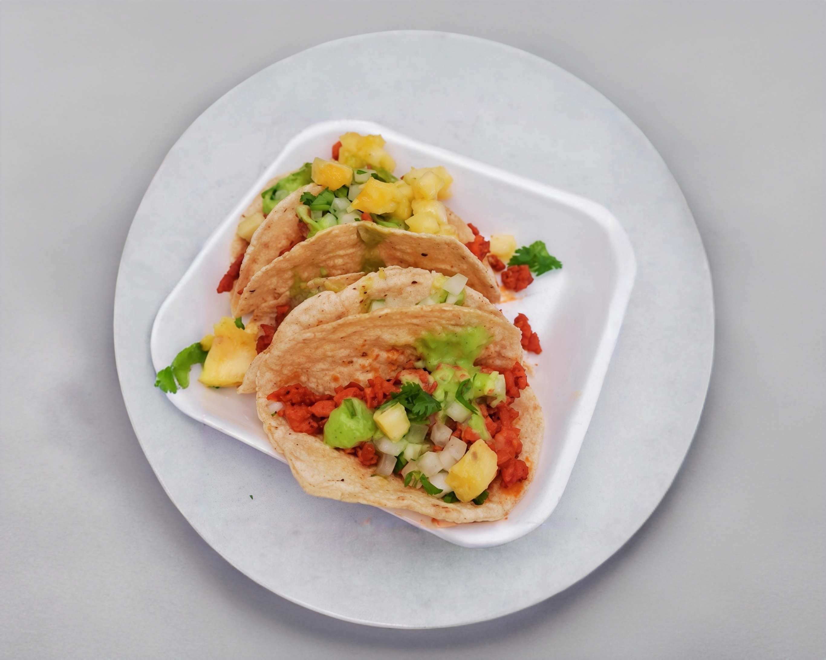 4 tacos al pastor acompañados de salsa verde, salsa roja, guacamole, piña y limon
