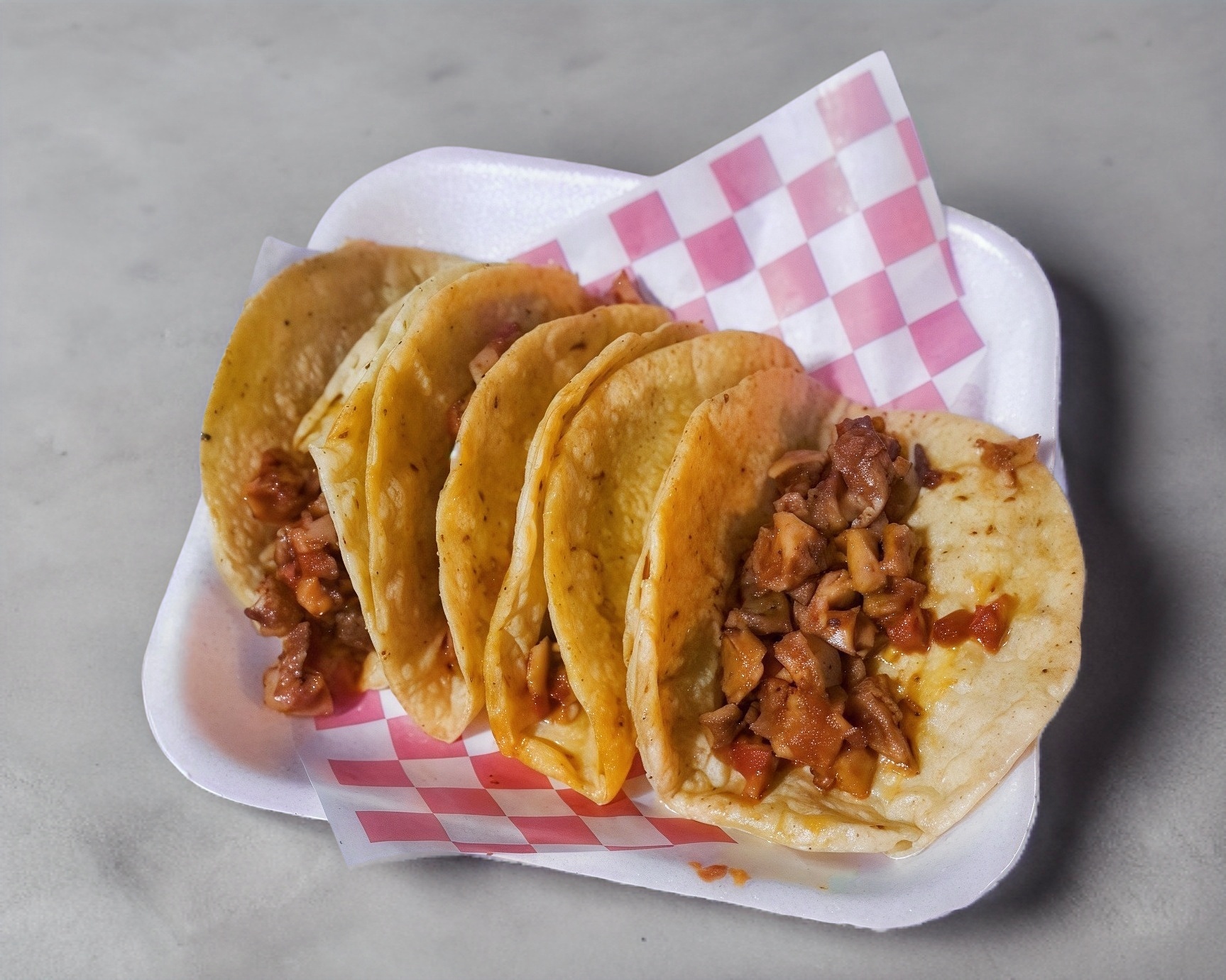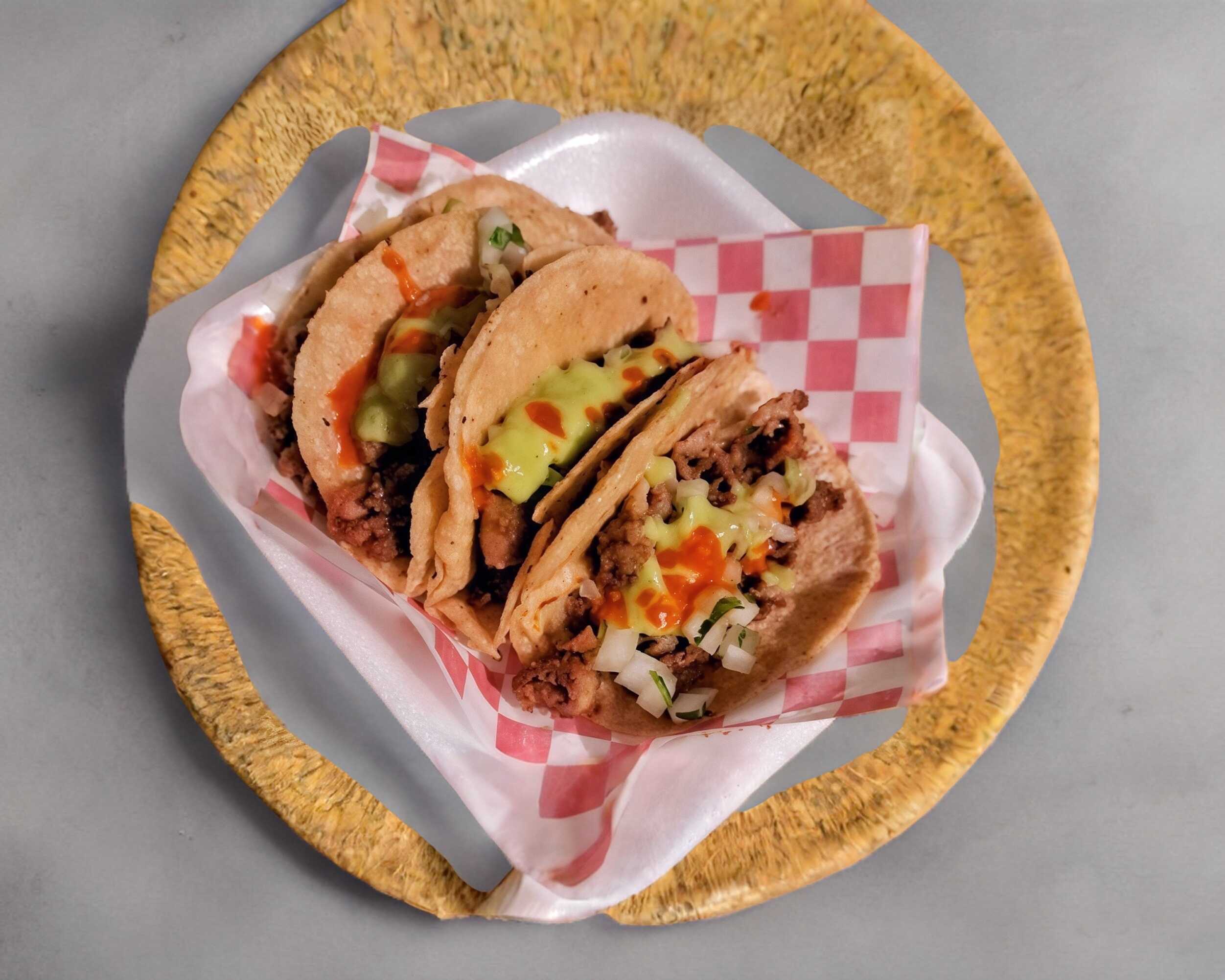 tacos de tripita, acompañados de salsa roja verde, guacamole,limon,cebolla con cilantro