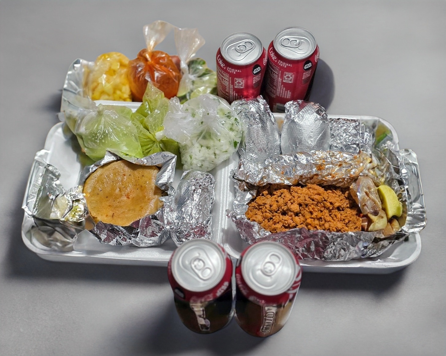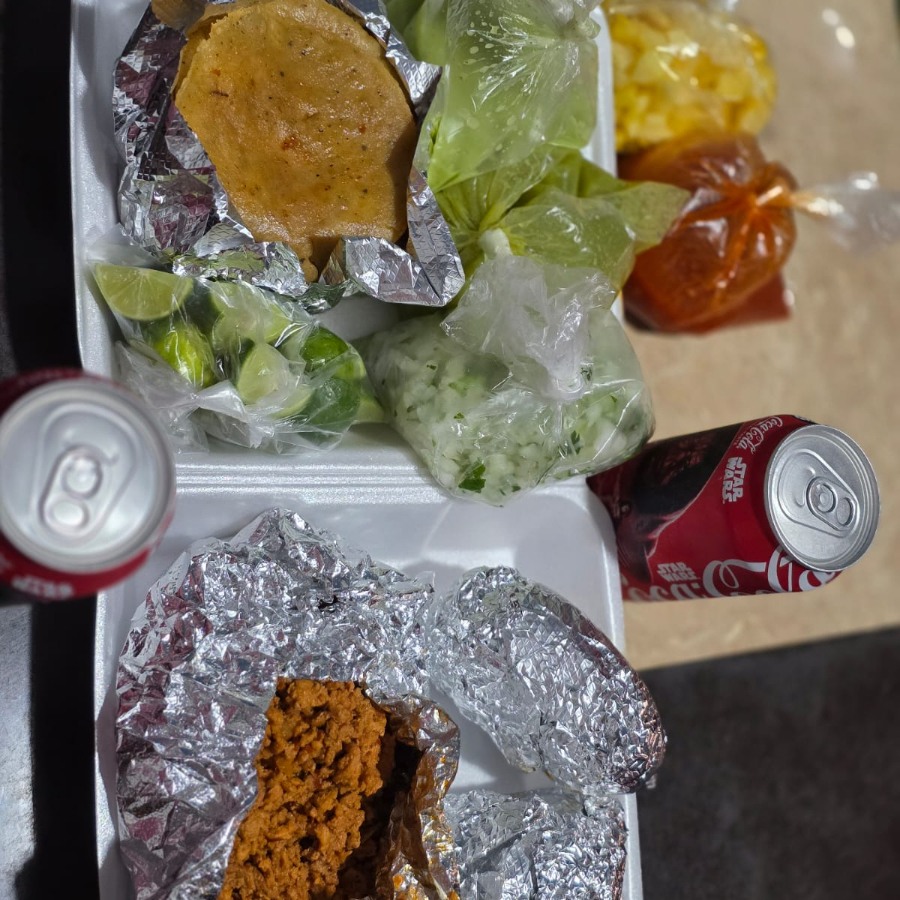 500gr de pastor, tortillas, 4 papas con mantequilla, 4 cocas, limones y salsas