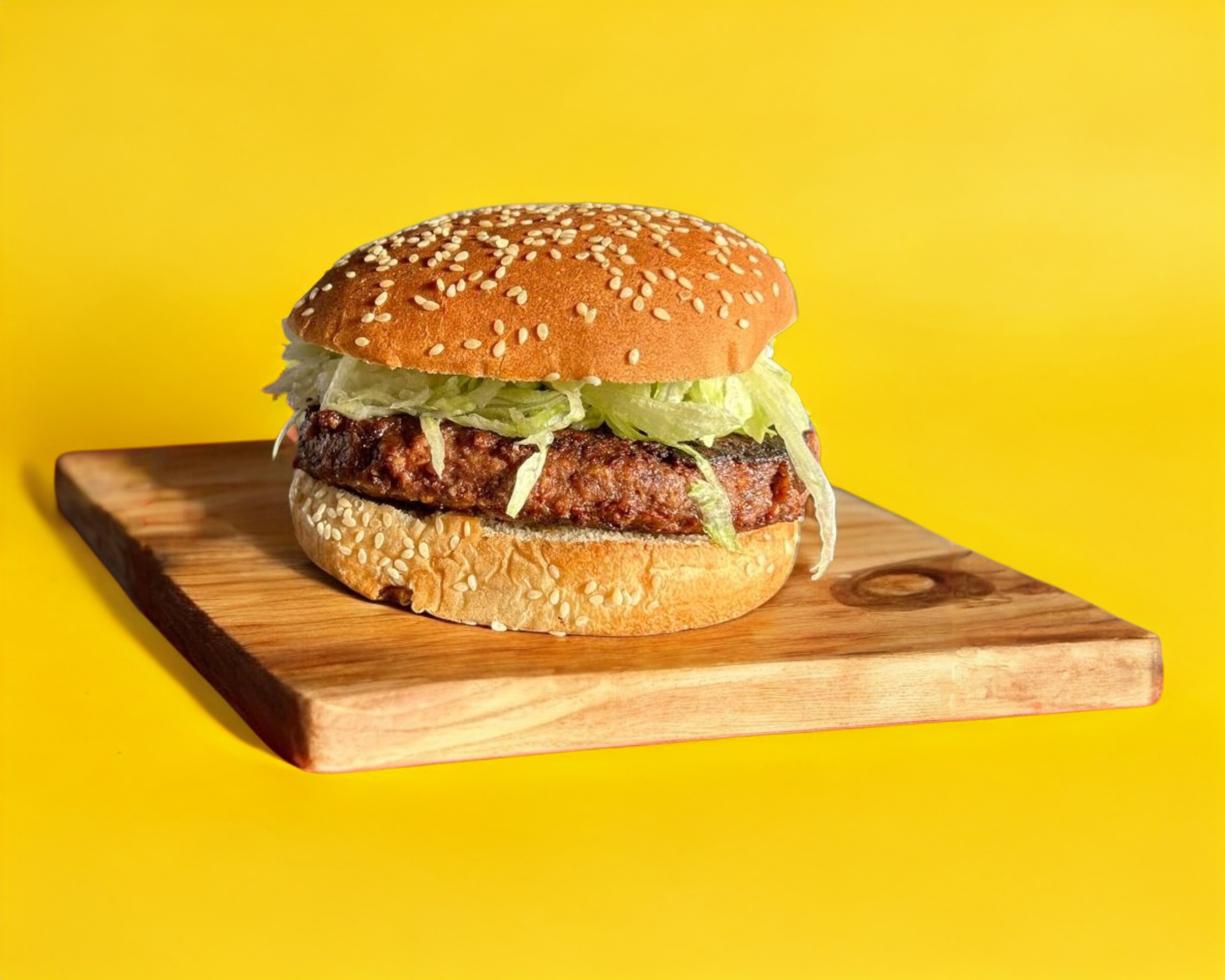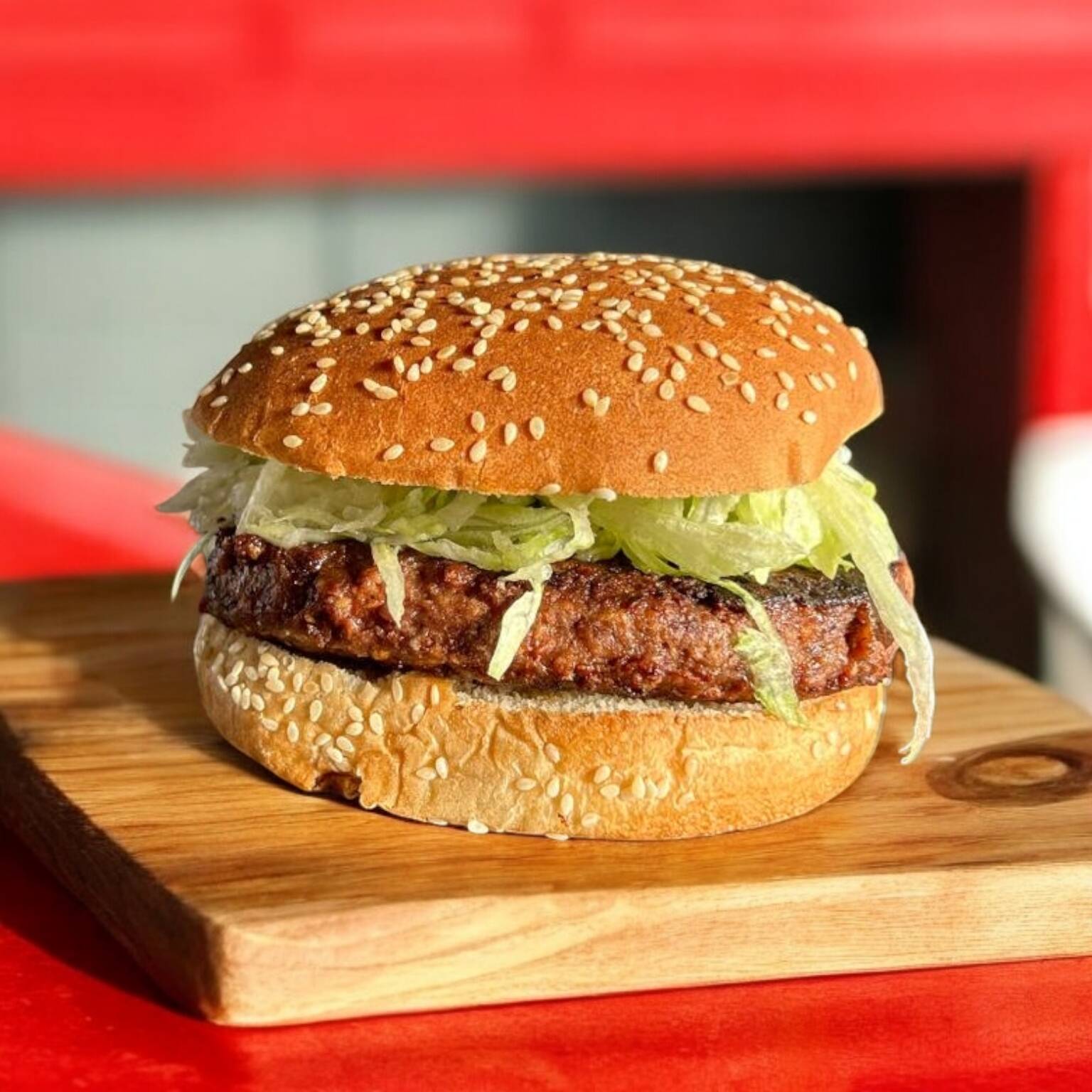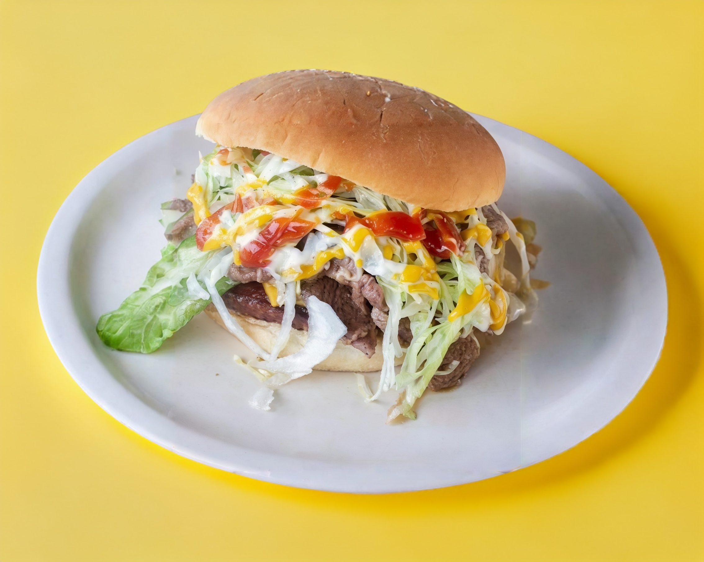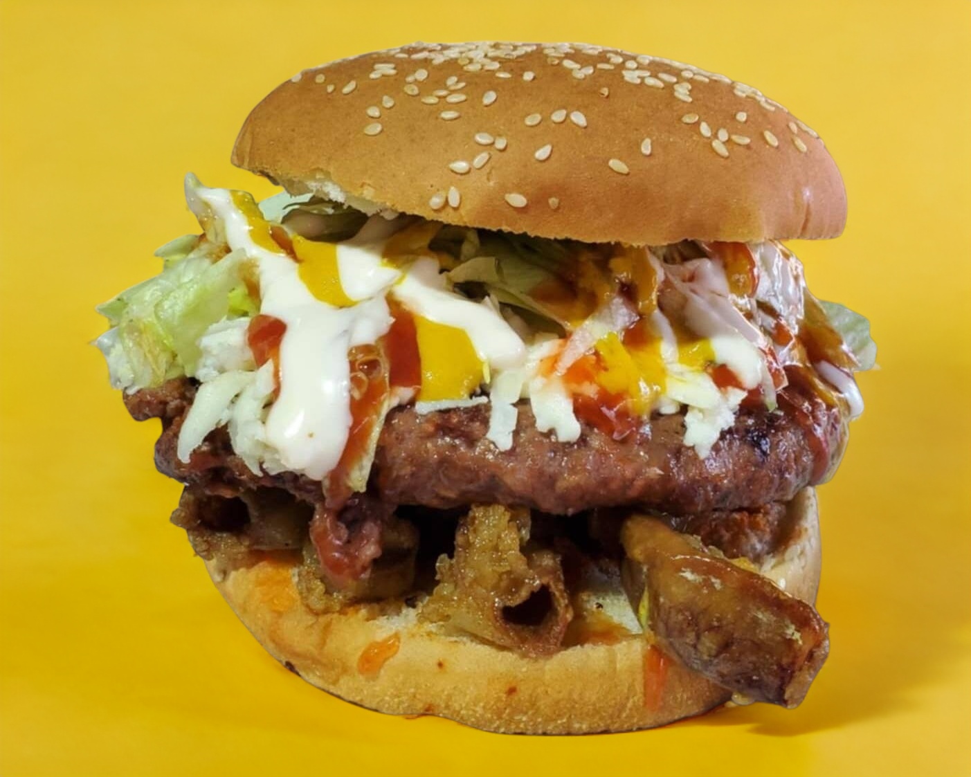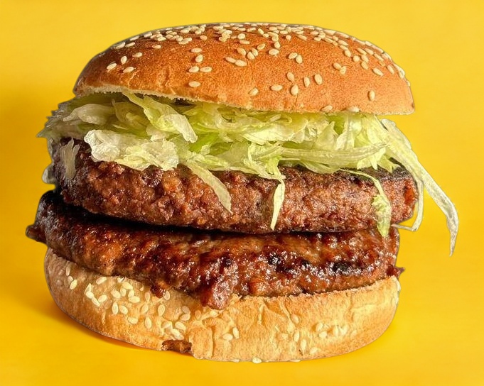 2 Carnes de hamburguesa, queso, lechuga y líquidos.