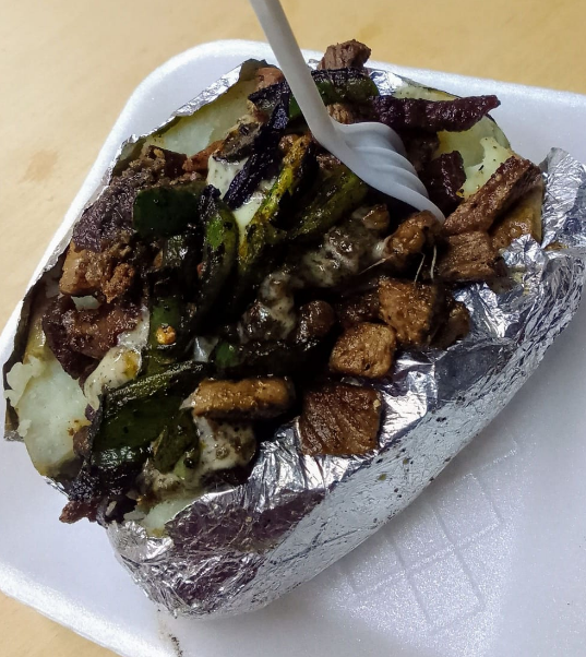 Papa con mantequilla, bistec y queso menonita (cebolla con cilantro, limon y salsa roja)