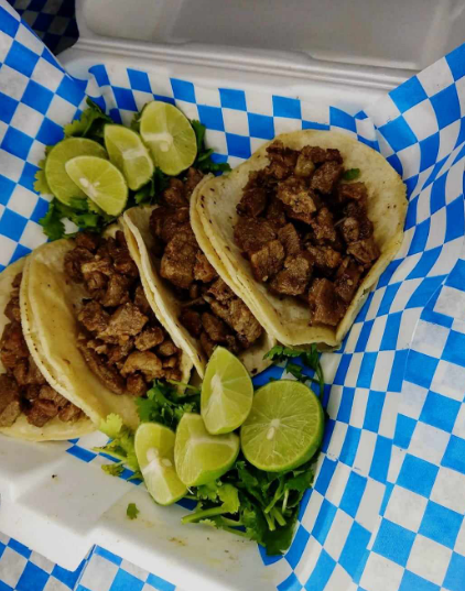 Tacos con tortilla de maíz, bistec, cebolla, cilantro, salsa roja, repollo y limón. 4 piezas.