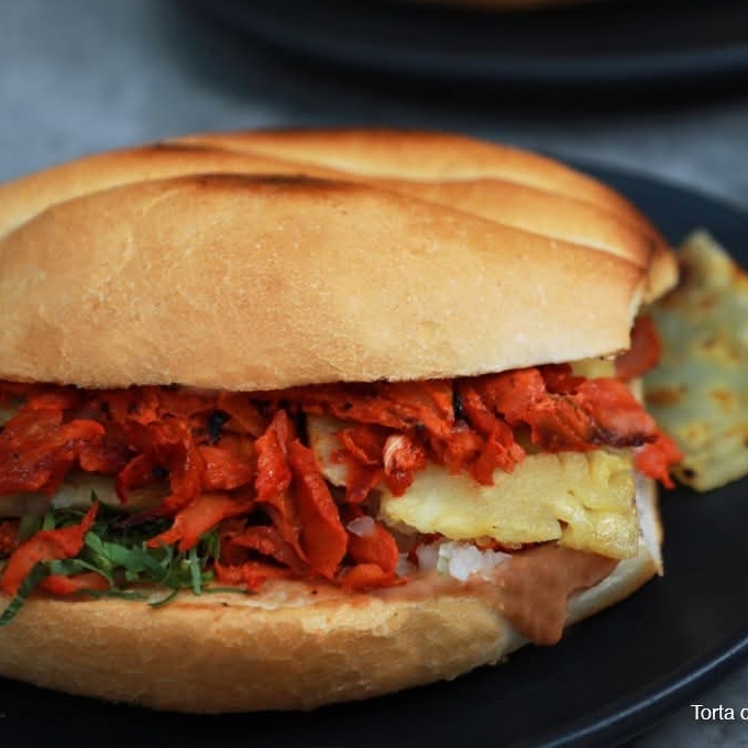 Pan, aguacate, pastor, lechuga, tomate, mayonesa.