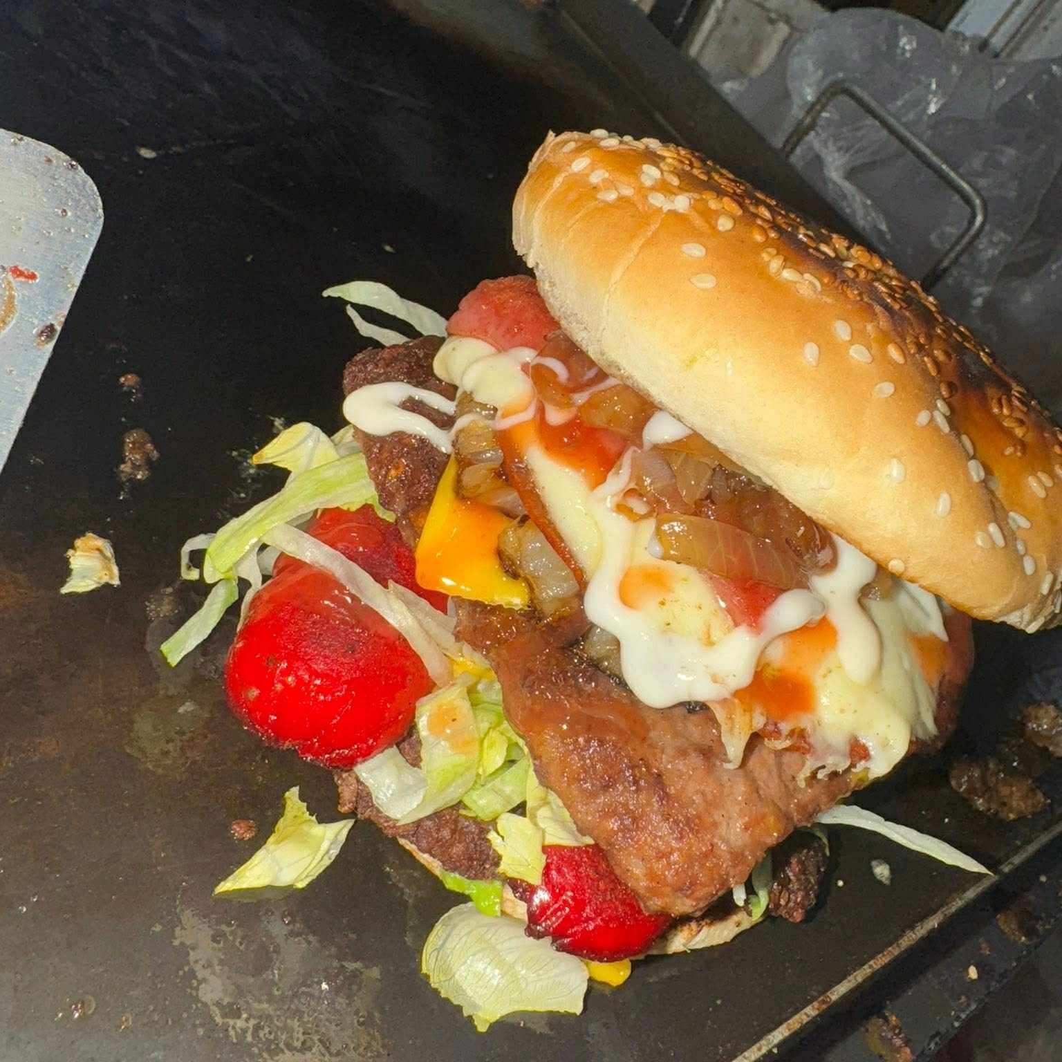 Pan, winnie 1/4 de libras de res, queso amarillo, frijol, tocino, mayonesa, mostaza, catsup y pepinillos.