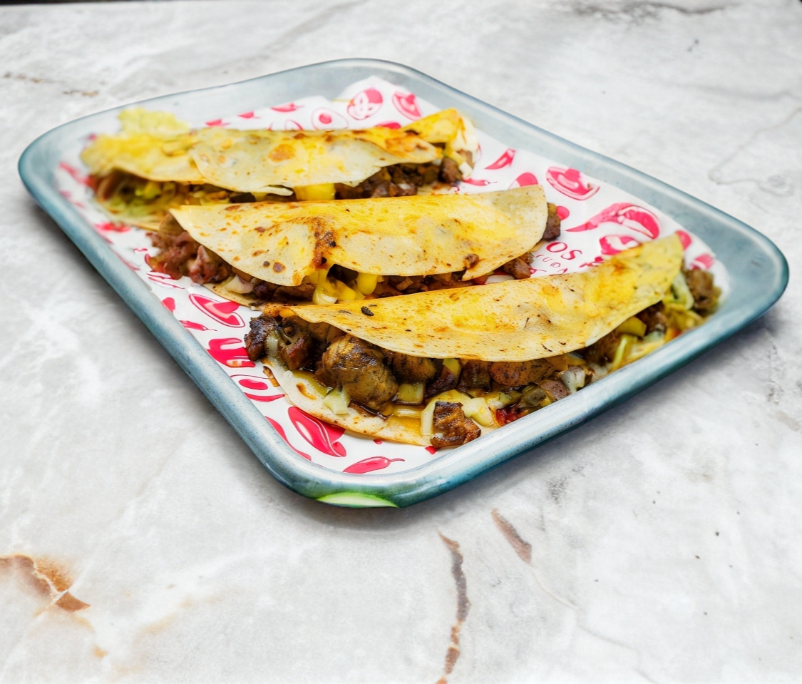 Quesadilla con doble tortilla de maiz con 45 gr de carne asada o pastor y guacamole, pon nos un comentario de tu eleccion