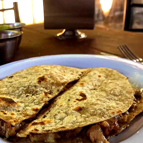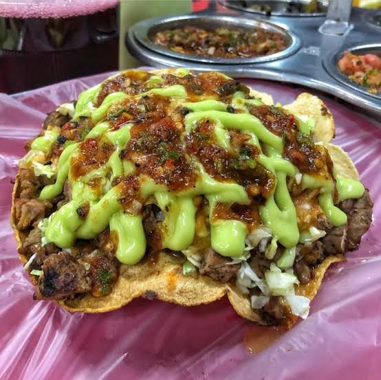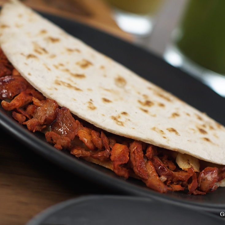 tortilla dorada con queso y carne asada, con sus salsas aparte