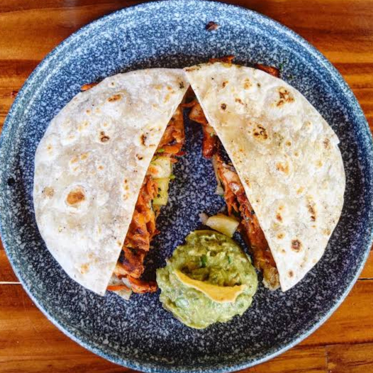 2 quesadillas empalmadas de carne asada ,con sus salsas aparte