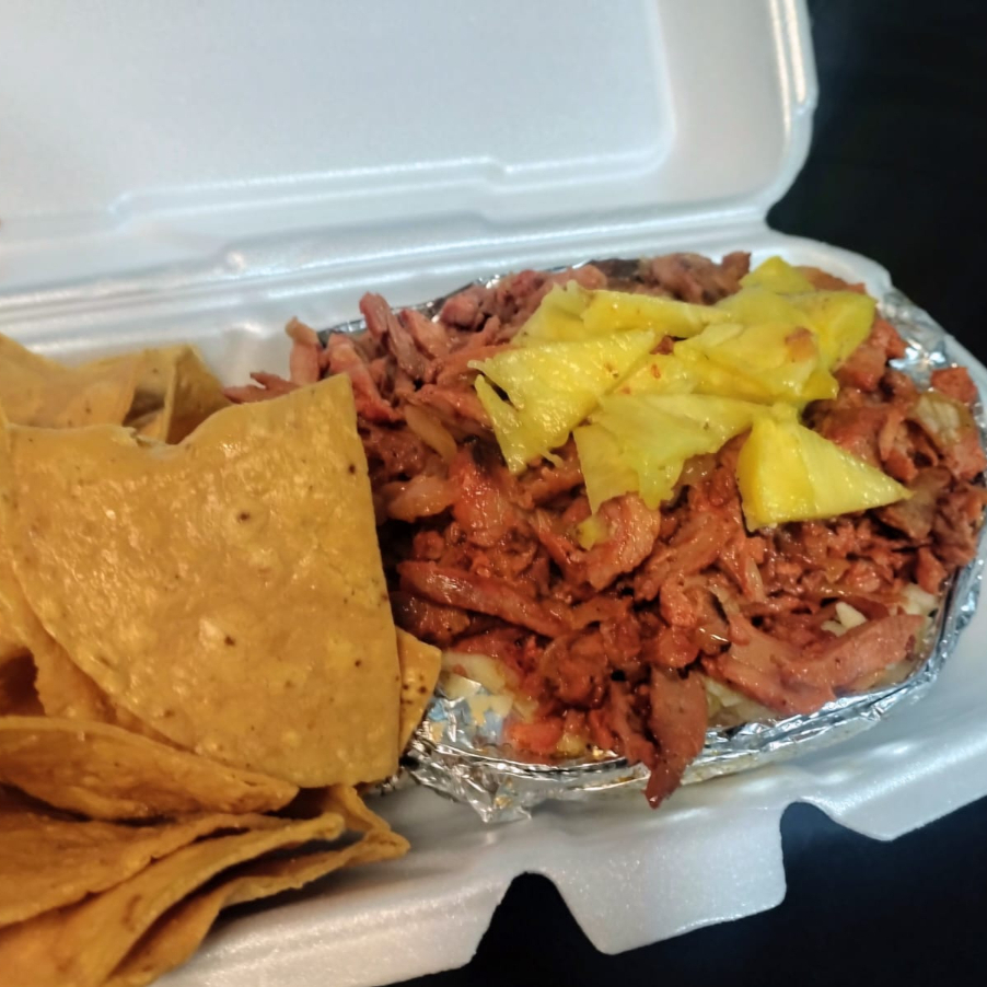 Pastor con queso 1 kg, tortillas, cebolla, cilantro, limones, salsas y piña