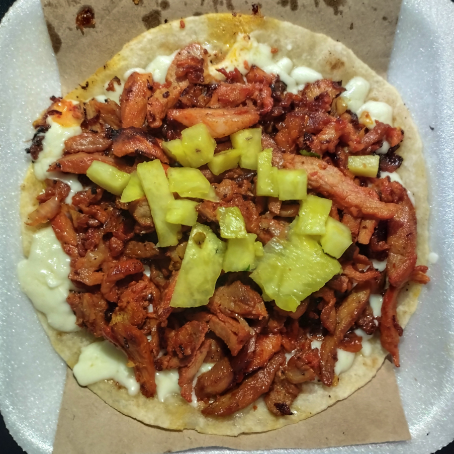 Tortilla de harina tamaño Tía Rosa, costra de queso, carne al pastor y piña