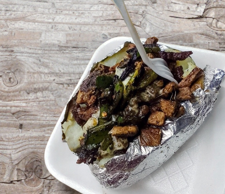 Papa con mantequilla, bistec y queso menonita (cebolla con cilantro, limon y salsa roja)