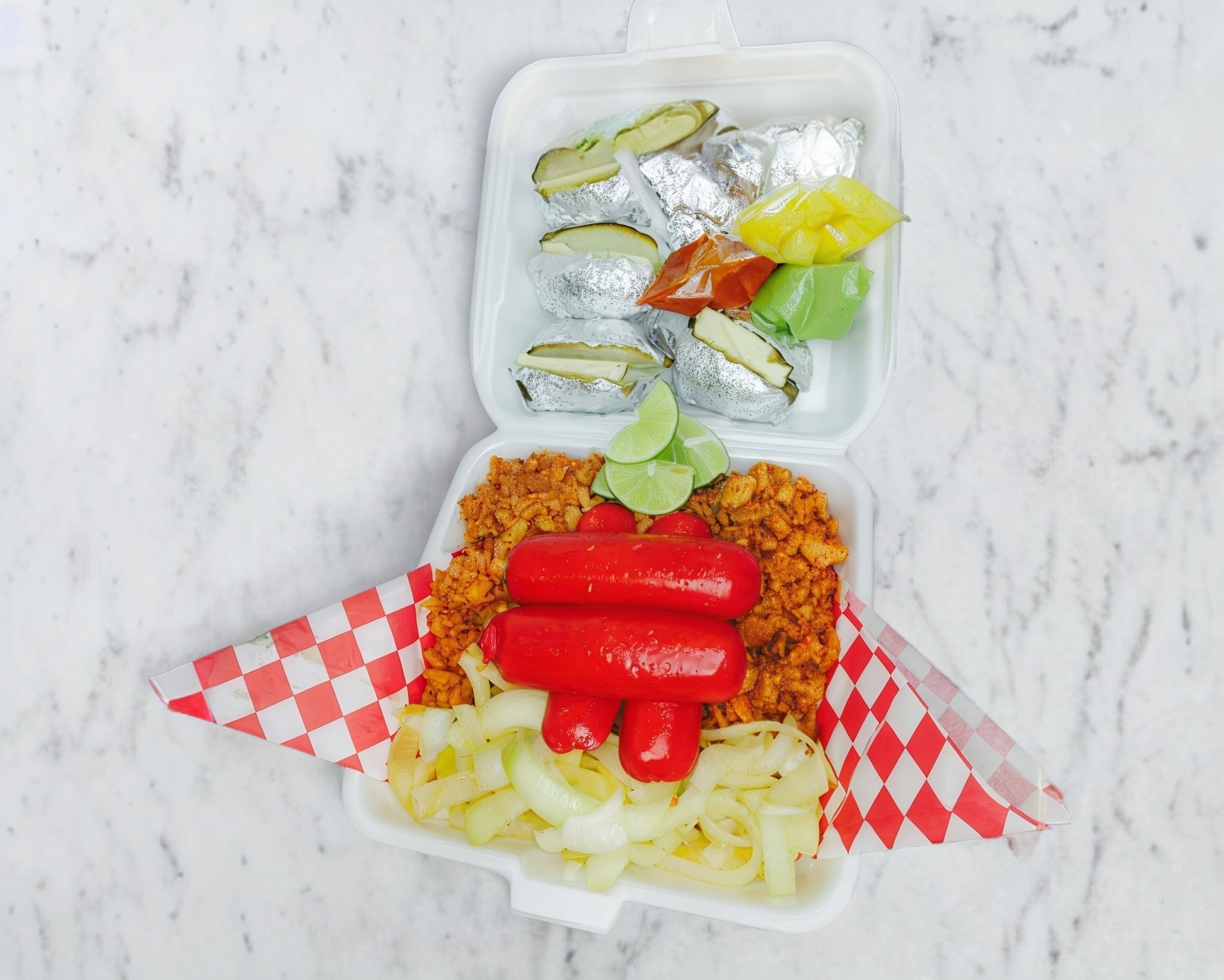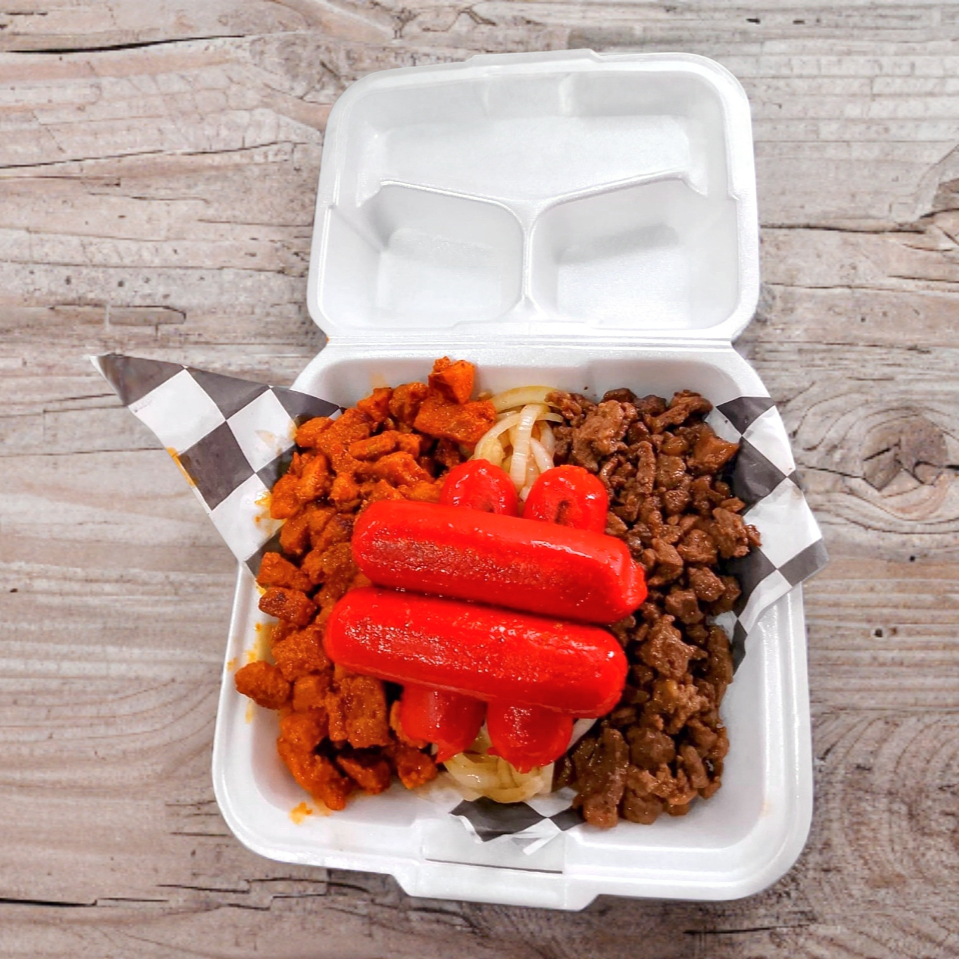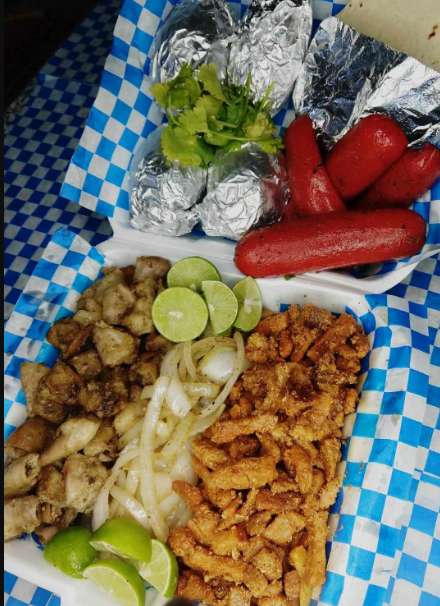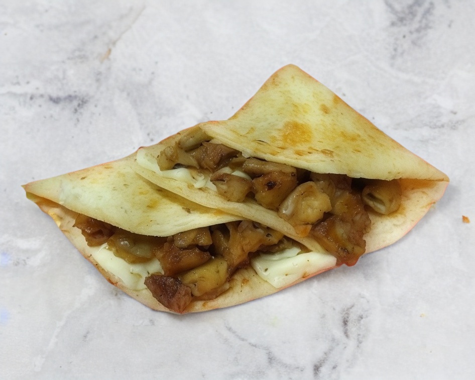 Tortilla de harina con queso menonita, carne al pastor, cebolla con cilantro, salsa roja y limón.
