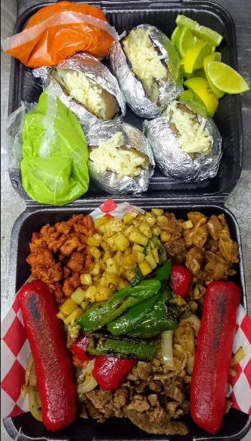 Parrillada de pastor, bistec y tripa (porción 4 - 5 ordenes), con 4 papas con mantequilla, 2 salchichas completas, 16 tortillas, cebolla frita, chiles toreados, guacamole, salsa roja, limones y piña. Para 4 personas.