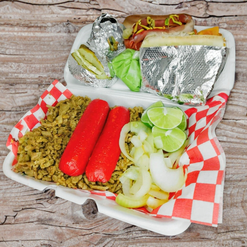 Parrillada de carne al pastor 453 gramos (porción 2 ordenes), con 2 papas con mantequilla, 1 salchicha completa, 8 tortillas, cebolla frita, chiles toreados, guacamole, piña, salsa roja y limones. Para 2 personas.