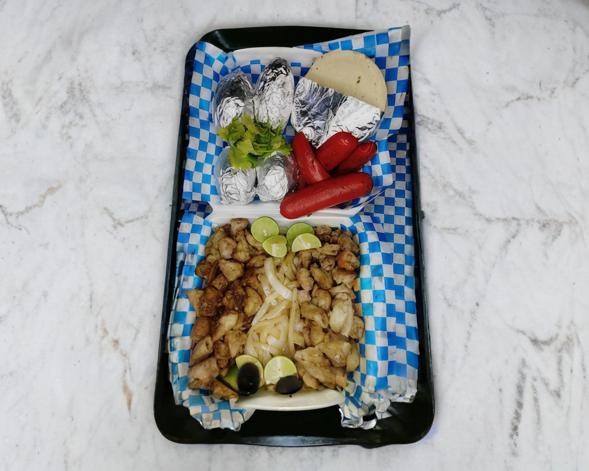 Parrillada de carne al pastor y tripa (porción 4 - 5 ordenes), con 4 papas con mantequilla, 2 salchichas completas, 16 tortillas, cebolla frita, chiles toreados, guacamole, salsa roja, limones y piña. Para 4 personas.