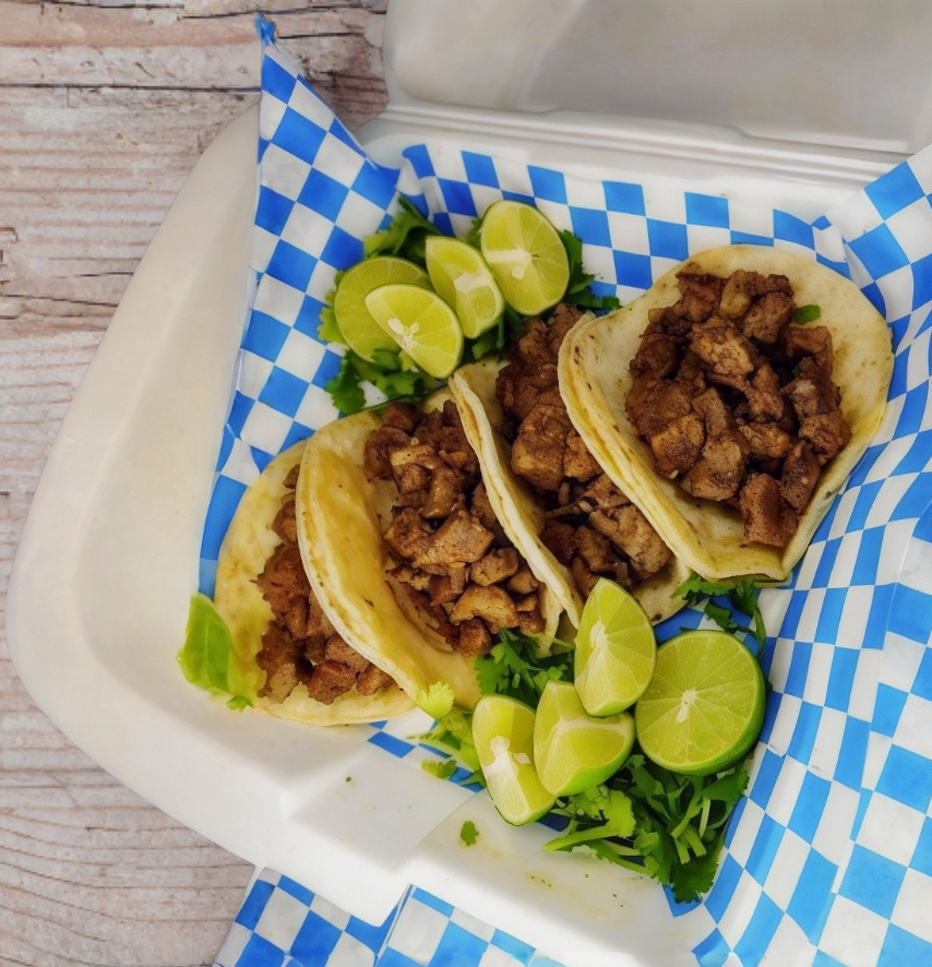 Tacos con tortilla de maíz, bistec, cebolla, cilantro, salsa roja, repollo y limón. 4 piezas.