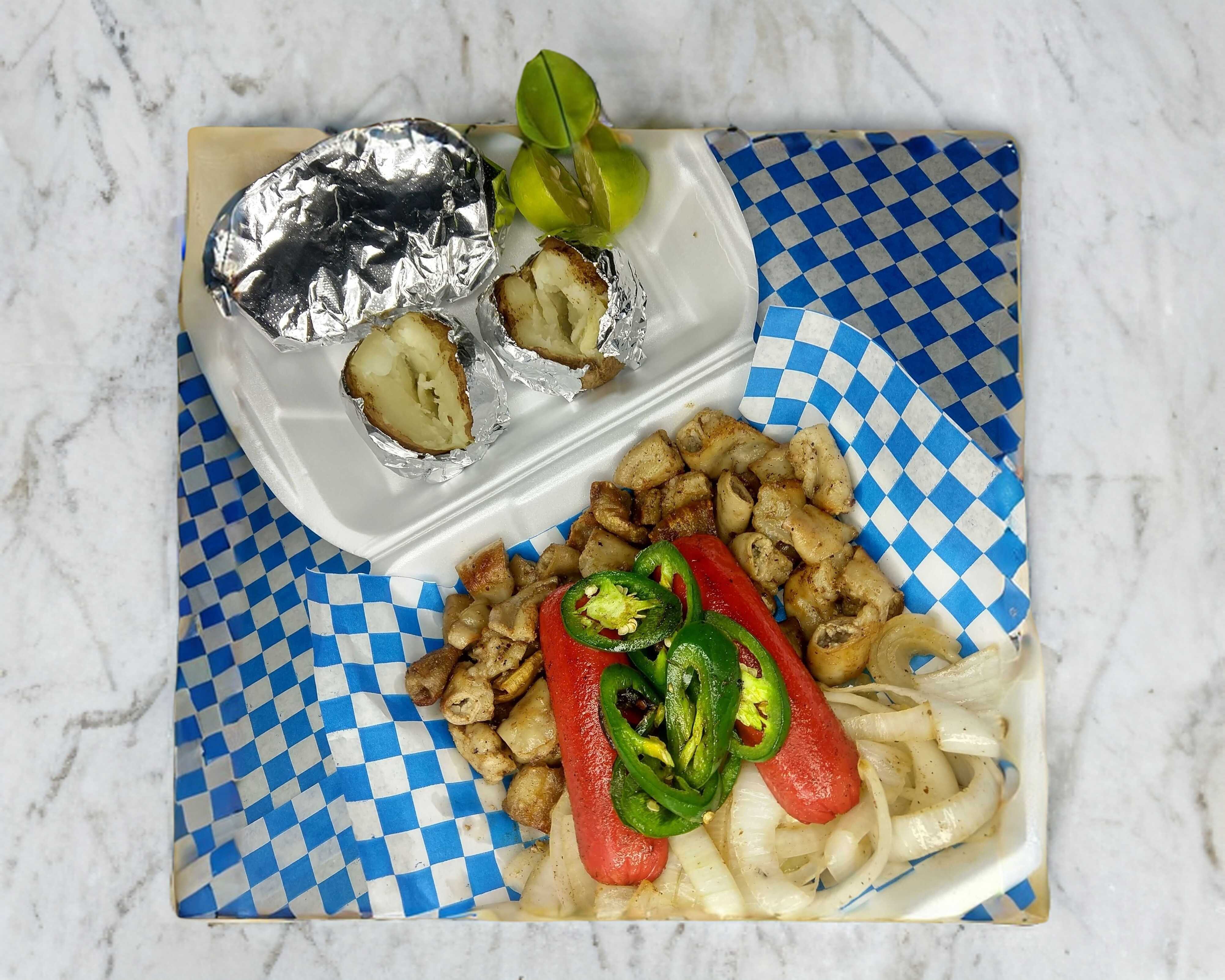Papa con mantequilla, queso menonita, carne al pastor, cebolla con cilantro, limon y salsa roja
