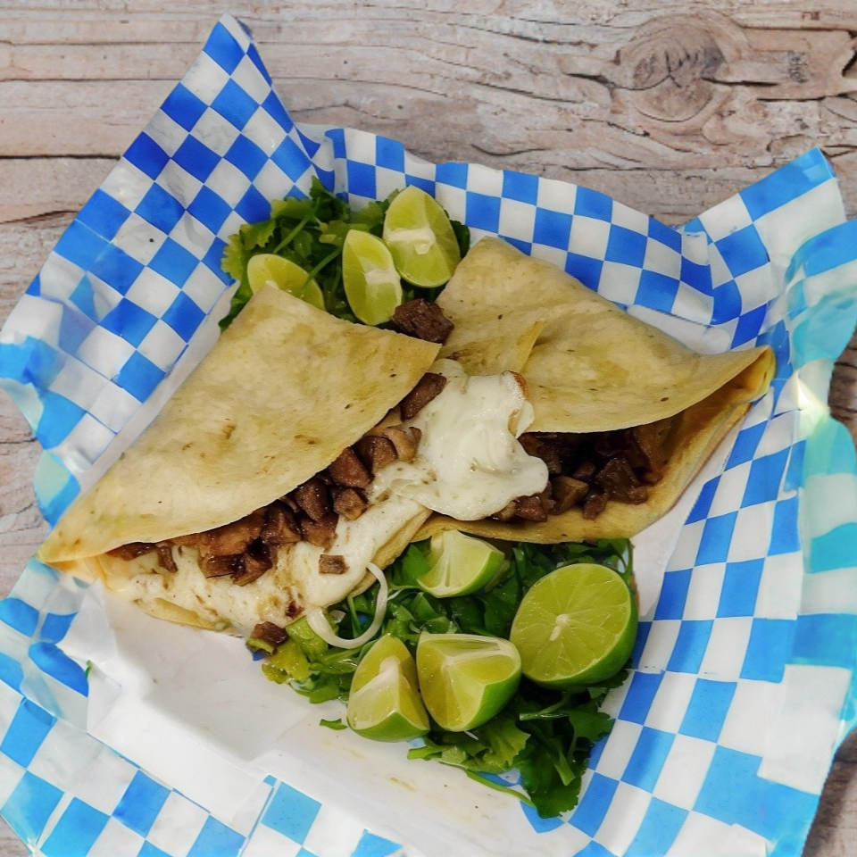 Tortilla de harina con queso menonita y bistec, cebolla con cilantro, salsa roja y limón.
