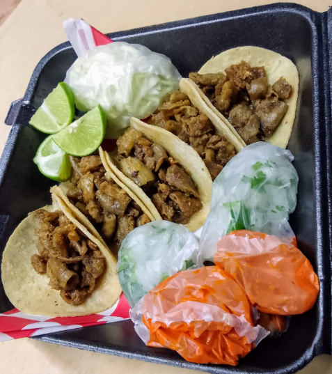 Tacos con tortilla de maíz, tripa, cebolla con cilantro, salsa roja, repollo y limón. 4 piezas.