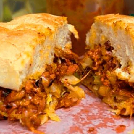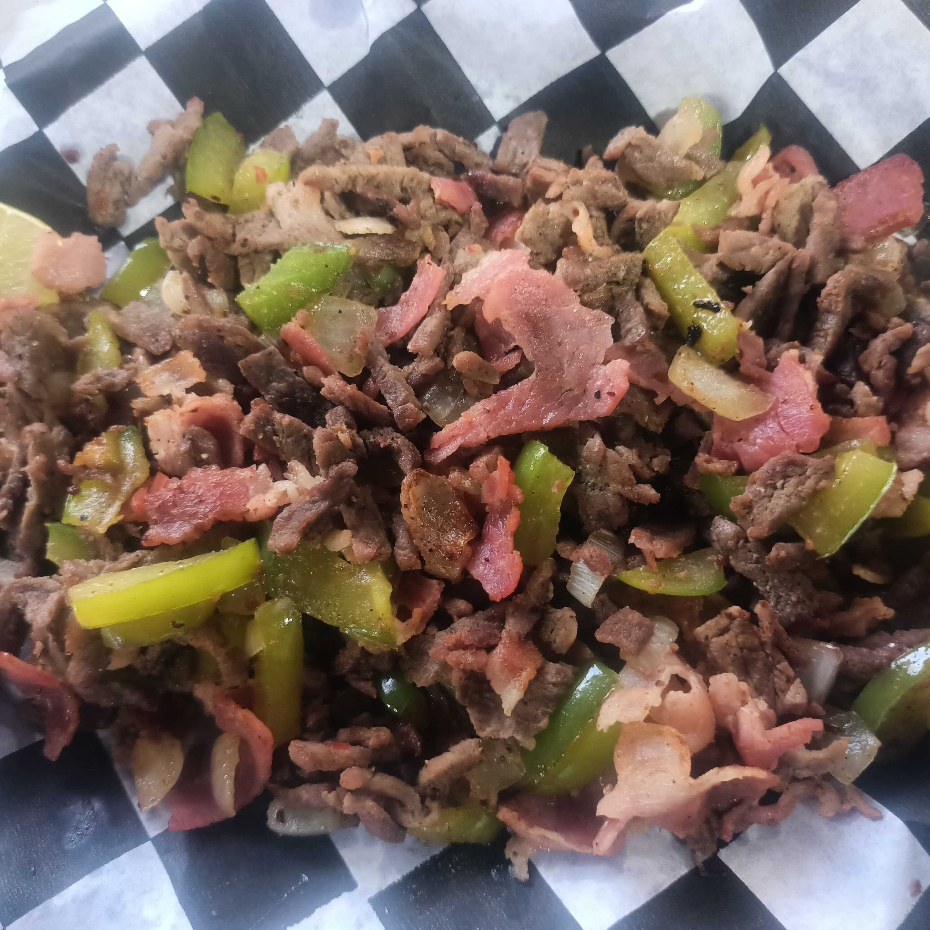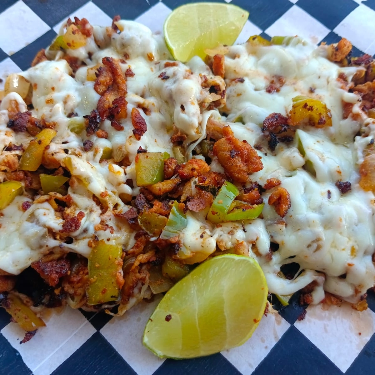 Rica carne al pastor, bistec, chorizo casero, pimiento, cebolla, queso gratinado