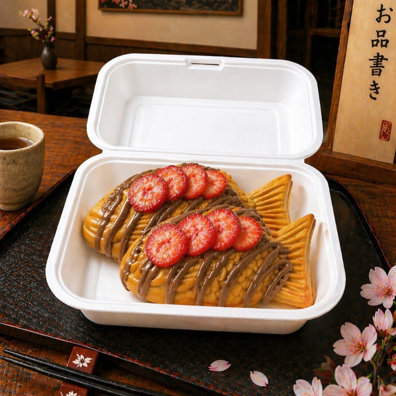 Taiyakis Rellenos y cubiertos al gusto, con rodajas de fresa.