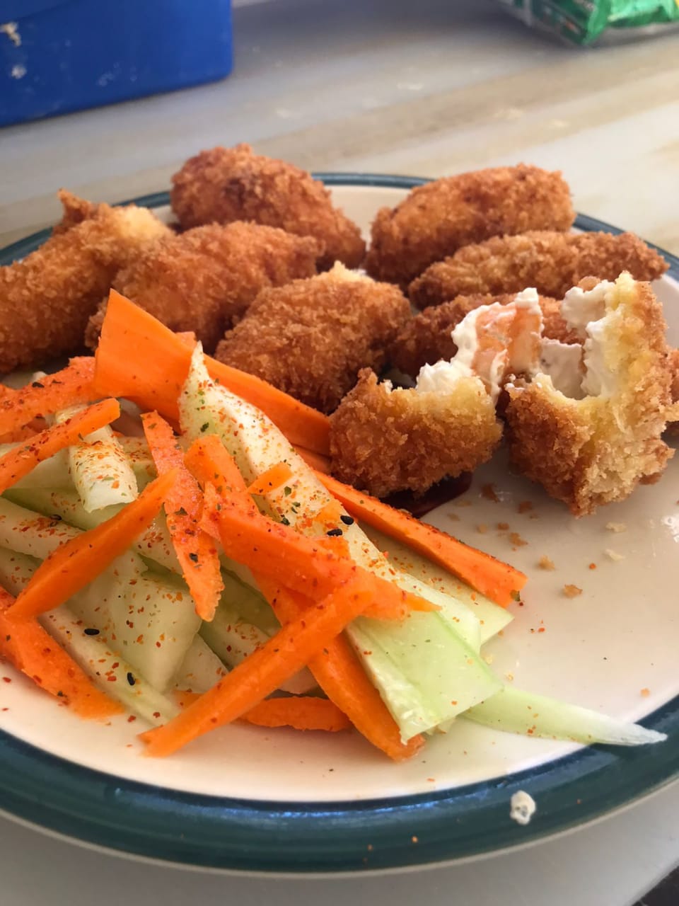Camarón relleno de philadelphia (8 piezas). Acompañados de zanahoria y pepino.