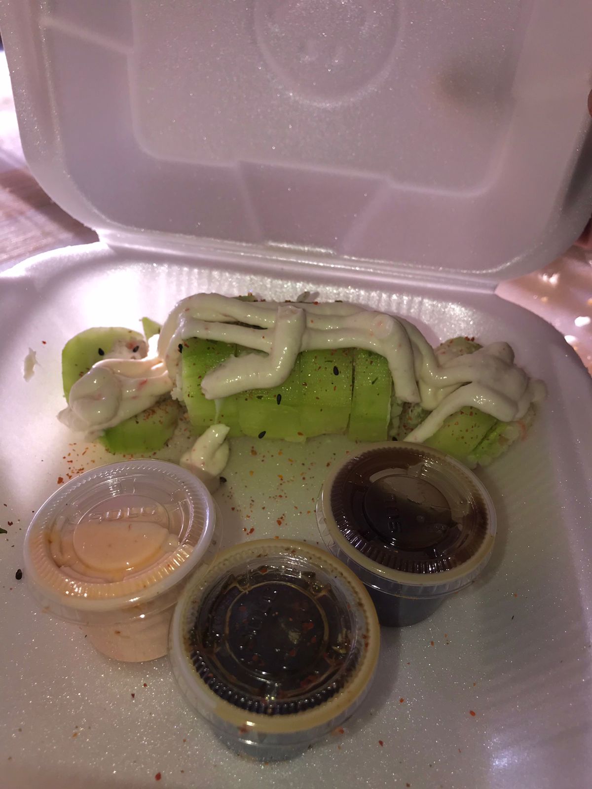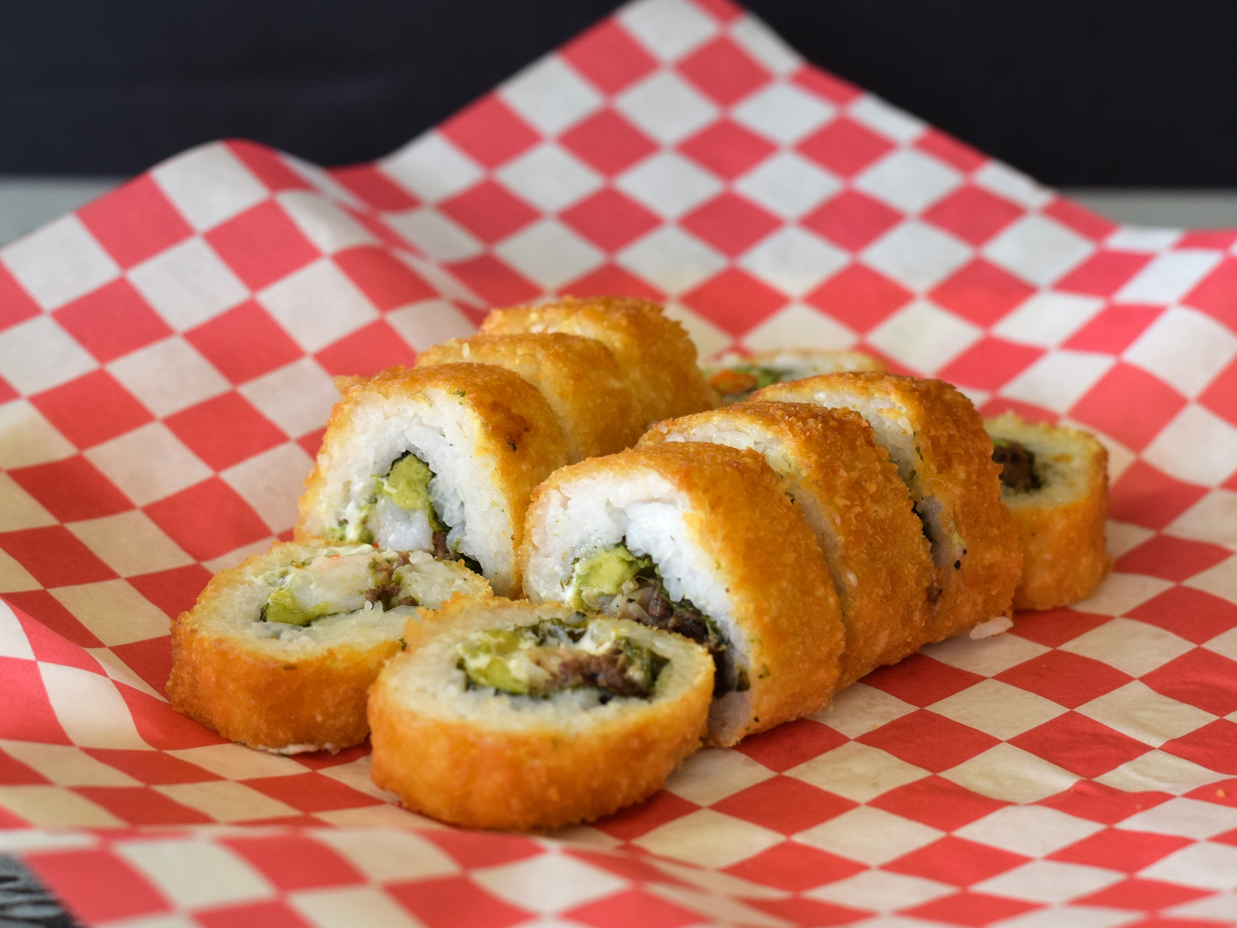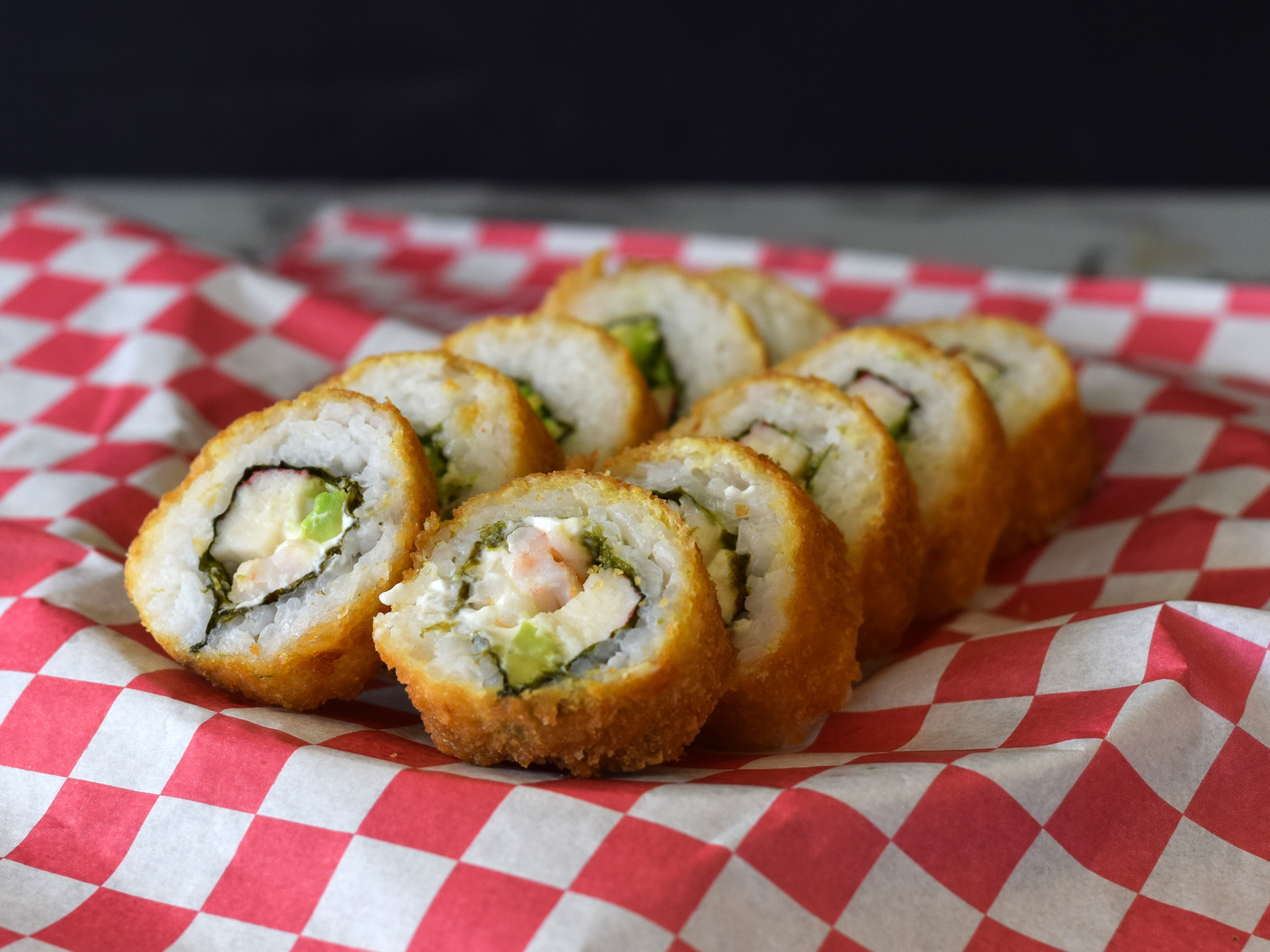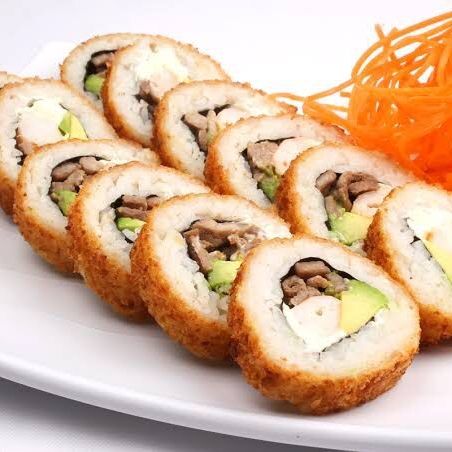 Rollo fresco relleno de aguacate, pepino, zanahoria, queso crema, y forrado de alga o ajonjolí.