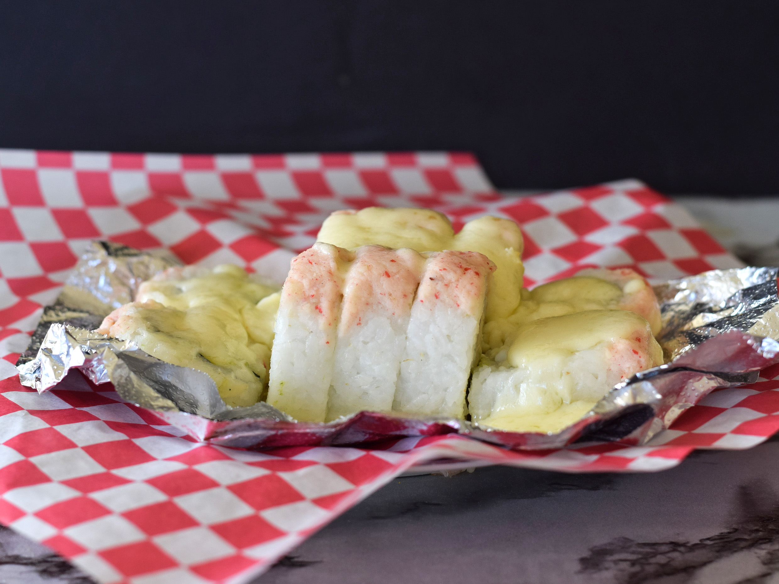 Philadelphia, surimi, camarón, aguacate, gratinado en queso manchego.